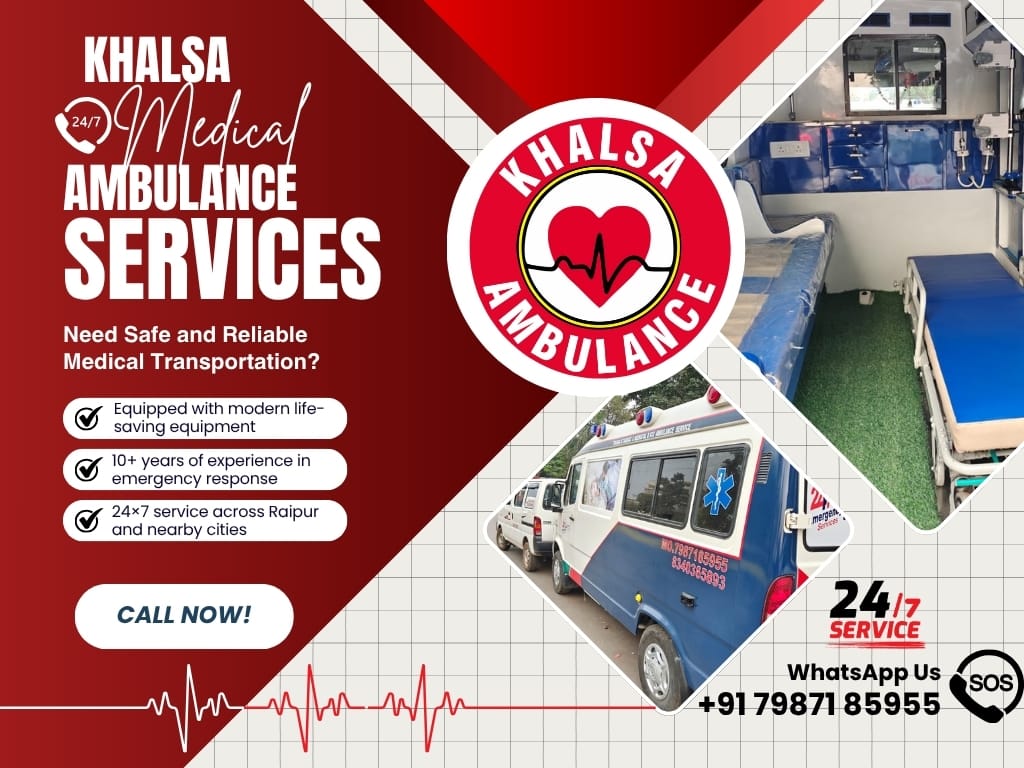 When every second counts, trust Khalsa Ambulance Service — Raipur’s most reliable 24×7 emergency partner. With 10+ years of experience, trained paramedics, and fully equipped ambulances, we reach you faster than you expect and care like family. Whether it’s a medical emergency, hospital transfer, or intercity support — we’re just one call away. Because in critical moments, delay nahi, action chahiye. 👉 Your safety, our priority — every time, everywhere.